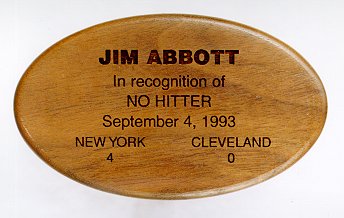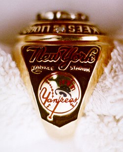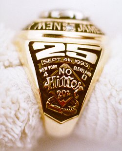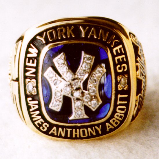 This legendary pitcher pitched a no hitter against the Cleveland Indians, and for this feat, Recollectics produced a championship ring. This beautiful piece of jewelry features the "NY" Yankees logo, as well as "Jim Anthony Abbott", 25 (his NY Yankee jersey), Sept. 4th, 1993, New York 4 Cleveland 0, New York, and Yankee Stadium. The ring is constructed of solid 14K gold encrusted with diamonds, as well as blue onyx. |
