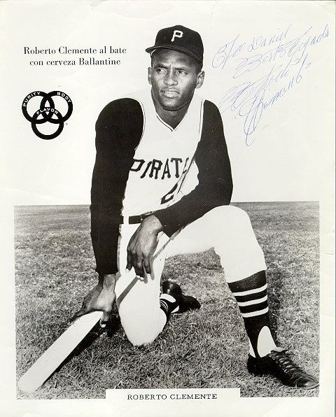 Spanish Ballantine beer promo shows Clemente kneeling in his Pirates uniform with bat in hand, inscribed, "To Daniel, Best Regards, Roberto Clemente" Photograph signed, 8 x 10".